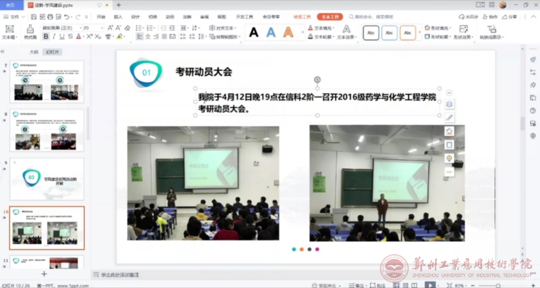 张家耀老师首先对学风的含义进行讲解,并以此举例说明学风建设的重要性,呼吁新同学努力学习。紧接着,以考研动员大会之全员宿舍、药学植物标本展览、科研成果展示、互联网大赛等各种全国性竞赛为背景,鼓励新生努力学习,以研究生为目标,奋发图强,扎实专业基础,不忘初心。其次,张家耀老师又向新生们讲述如何定位选择人生目标,怎样度过老员工活,并且就新生应该注意什么,给了同学们几点建议。